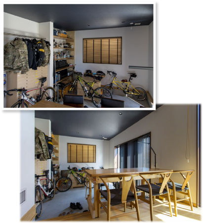 休日の日や仕事が早く終わった時には、リビング横の土間スペースで好きな自転車やバイクをいじるのが楽しみです。以前は外にあるガレージや倉庫で機械いじりをしていたので、冬の寒い時などはとても辛かったです。しかし今は「涼温な家」の中に土間スペースがあるので、どんな季節や天候でも存分に機械いじりができます。