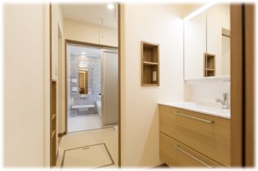 キッチンの脇には水回りがあります。洗面室と浴室、そしてパントリーがあり、さらにそこから廊下と玄関に出ることができます。玄関〜リビング〜水回り〜玄関とつながるので、家の中をぐるりと回遊することができ、動線に行き止まりがないので使いやすいさは抜群です。