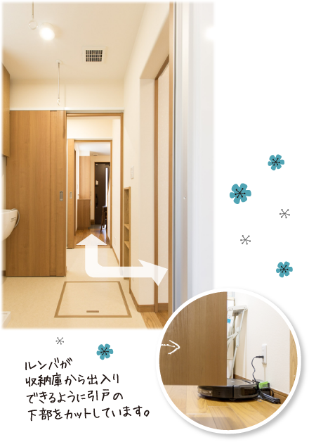また、水回りはぐるりと回れる間取りになっていますので掃除にはルンバを使っています。設計士さんのアイデアでルンバは収納庫の中にしまっていますが、夜中に自動運転でルンバが出入りできるように、収納引戸の下部をカットしています。