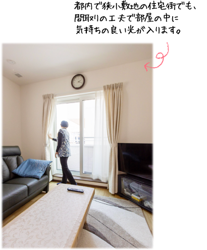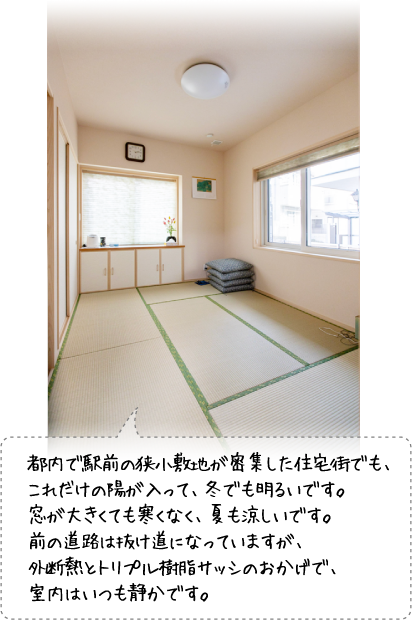 ここは駅に近い都内の狭い住宅地で、前の道が抜け道になっており交通量が多いのですが、家の中は都会の喧騒とは無縁でとても静かで暮らしやすいです。