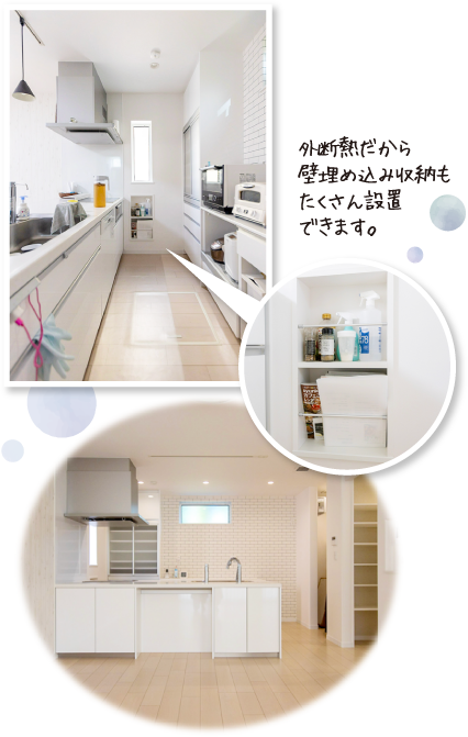キッチンからリビングを通らずに、納戸やクローゼット、水回り、そして玄関へも行くことができます。間仕切りや扉が少なく、空間が広くつながっているのに、壁掛けエアコンが1台もないことに、この家に来た友人やお客様は驚きます。「涼温な家」の良さを存分に活かした間取りだと思います。